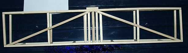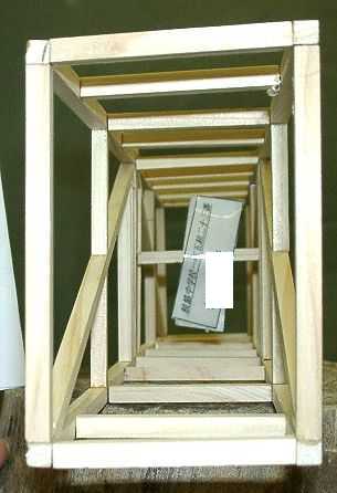 中央部の垂直の部材を複数にしたことにより,全体の変形に抵抗すること −−「まく板」のはたらきをする−−− また,斜めの梁材と垂直の柱がしっかり接着され,ゆがみ変形に抵抗すること, それから左右をつなぐ材料が多く,剛性の維持に役立っているようです.