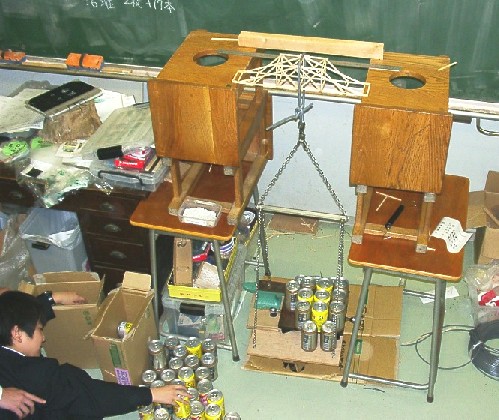 2003年度以降での設計規格での最高記録 −−−角材断面:4mm四方 耐荷重=38kg(以上) 2004年度 1年3組6班の橋 |